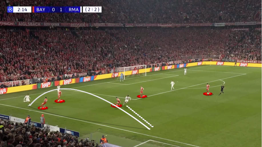 Bayern pressed with numbers; however, during the first half, Madrid were clever not to force short passes in build-up.