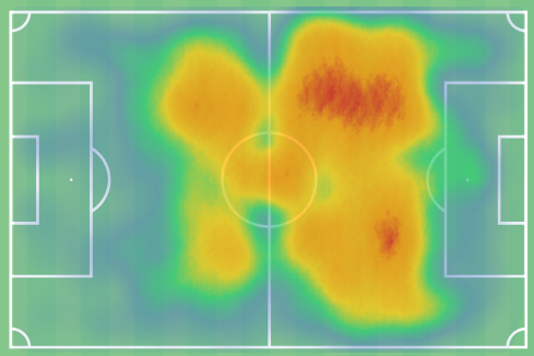 Furthermore, the significant density of actions within his own half, specifically in the right-central channel, confirms his evolved role in the initial build-up phase.