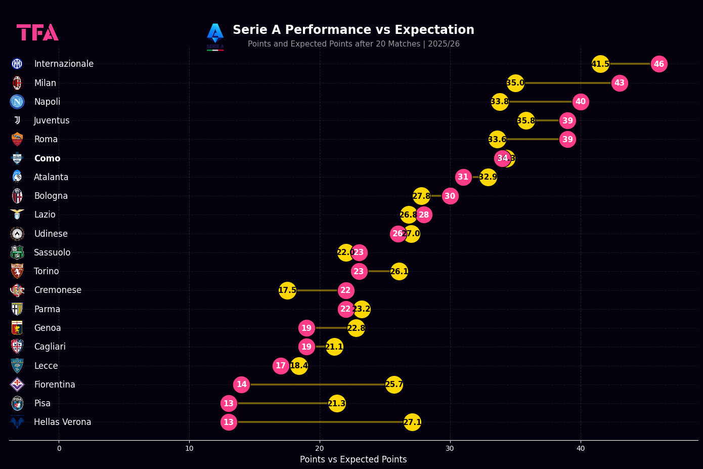 After 20 Serie A matches in 2025/2026, Como sits on 34 points, a return that almost perfectly aligns with their expected points total of 34.3.