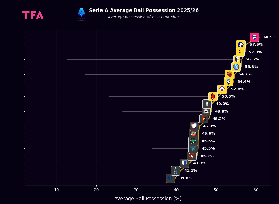 Serie A Average Ball Possession After 20 Matches 2025/2026