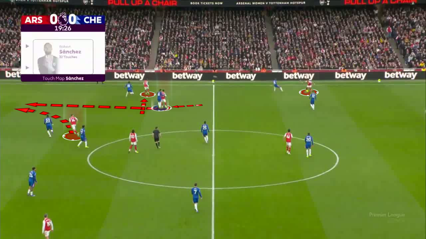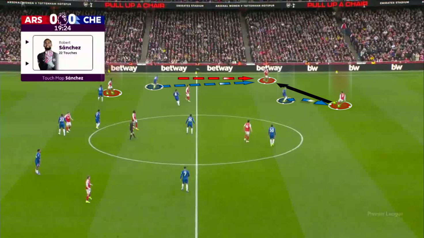 Chelsea, due to the fluidity of Arsenal’s movements and players dragging defenders into areas where they do not want to be, has just right-back Reece James as the only defender covering the goal area.