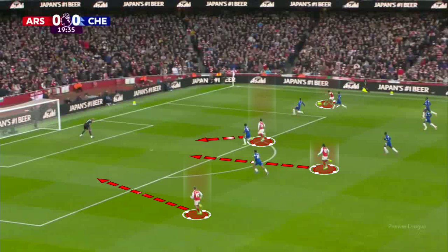 When Saka receives the ball, three of Chelsea’s back four are in their left wide-area.