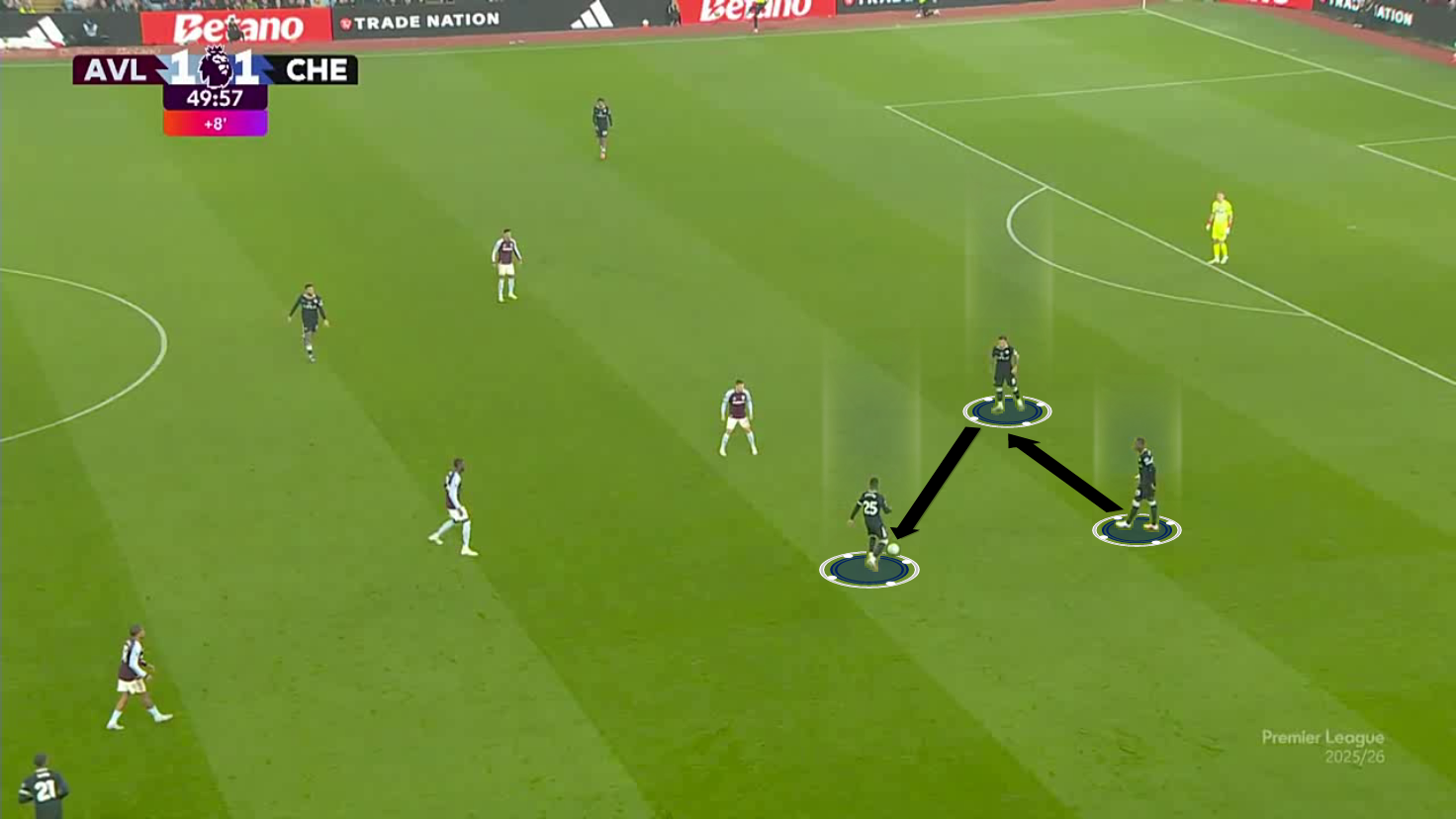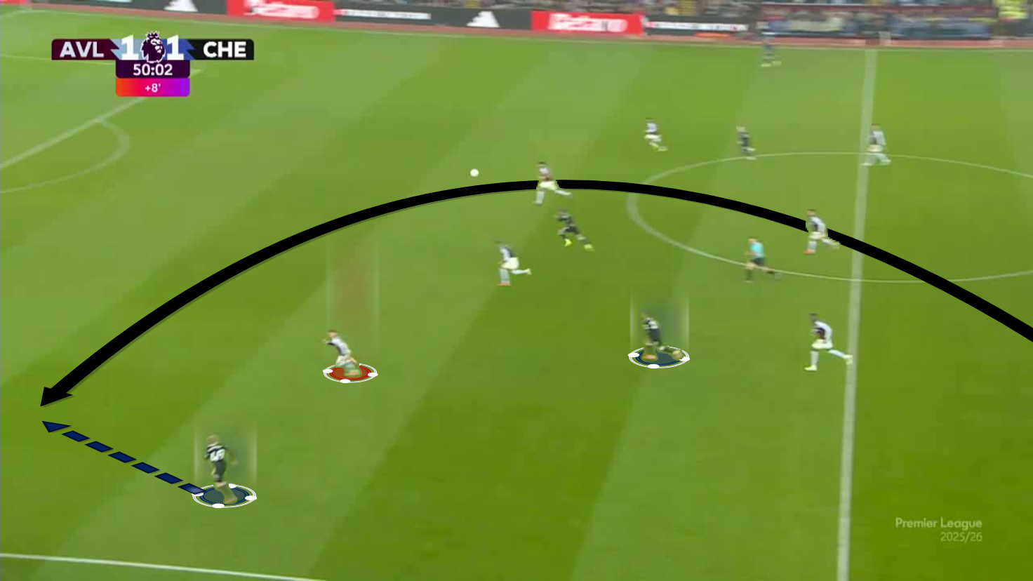 In this example from Chelsea’s 4-1 victory over Aston Villa, it is the movement of striker Pedro that creates the space for winger Alejandro Garnacho to receive behind Villa’s backline.