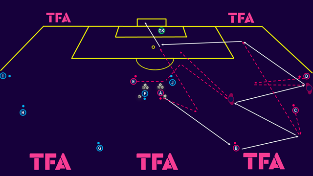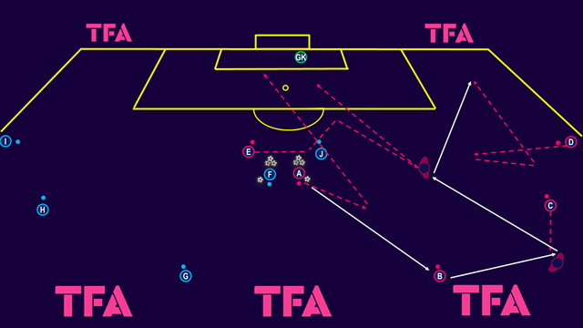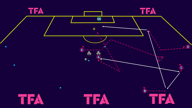 The play starts in the central midfield area, with player ‘A’ passing out to either their full-back or centre-back, before forward players begin making their pre-determined movements.