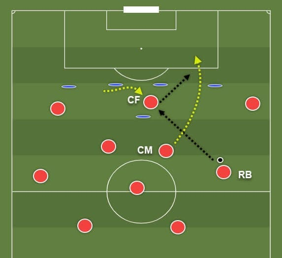 CF makes an angled run into the half-space, and that is the trigger for the CB to make the pass
