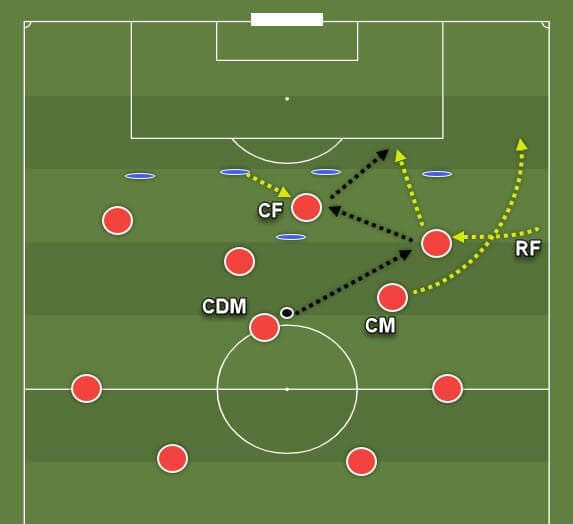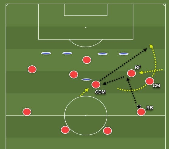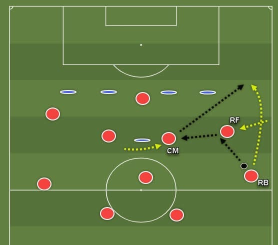 The RF should give the CM a pass that he can use to play a one-touch pass forward