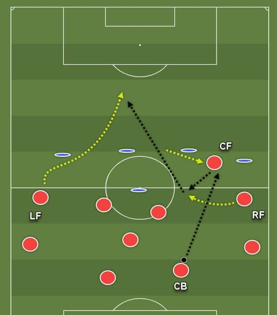 As the RF receives the ball, the CF then make a short run to be able to receive a pass