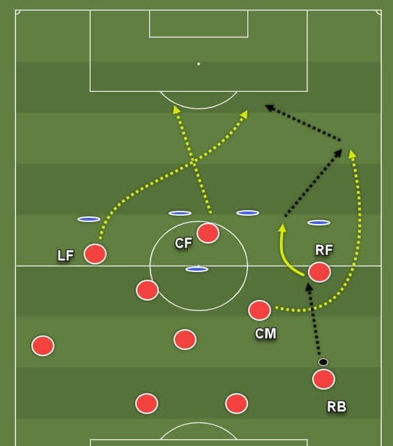 Meanwhile, the RFs should pass through the gap between the two centre-backs.