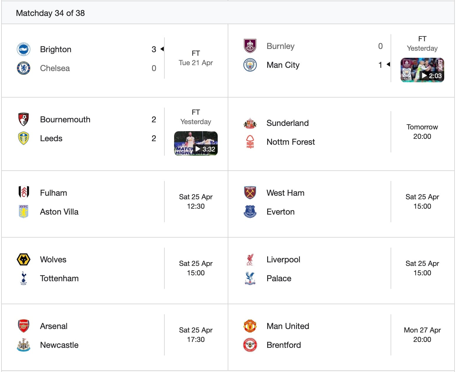 FPL Gameweek 34 Fixtures