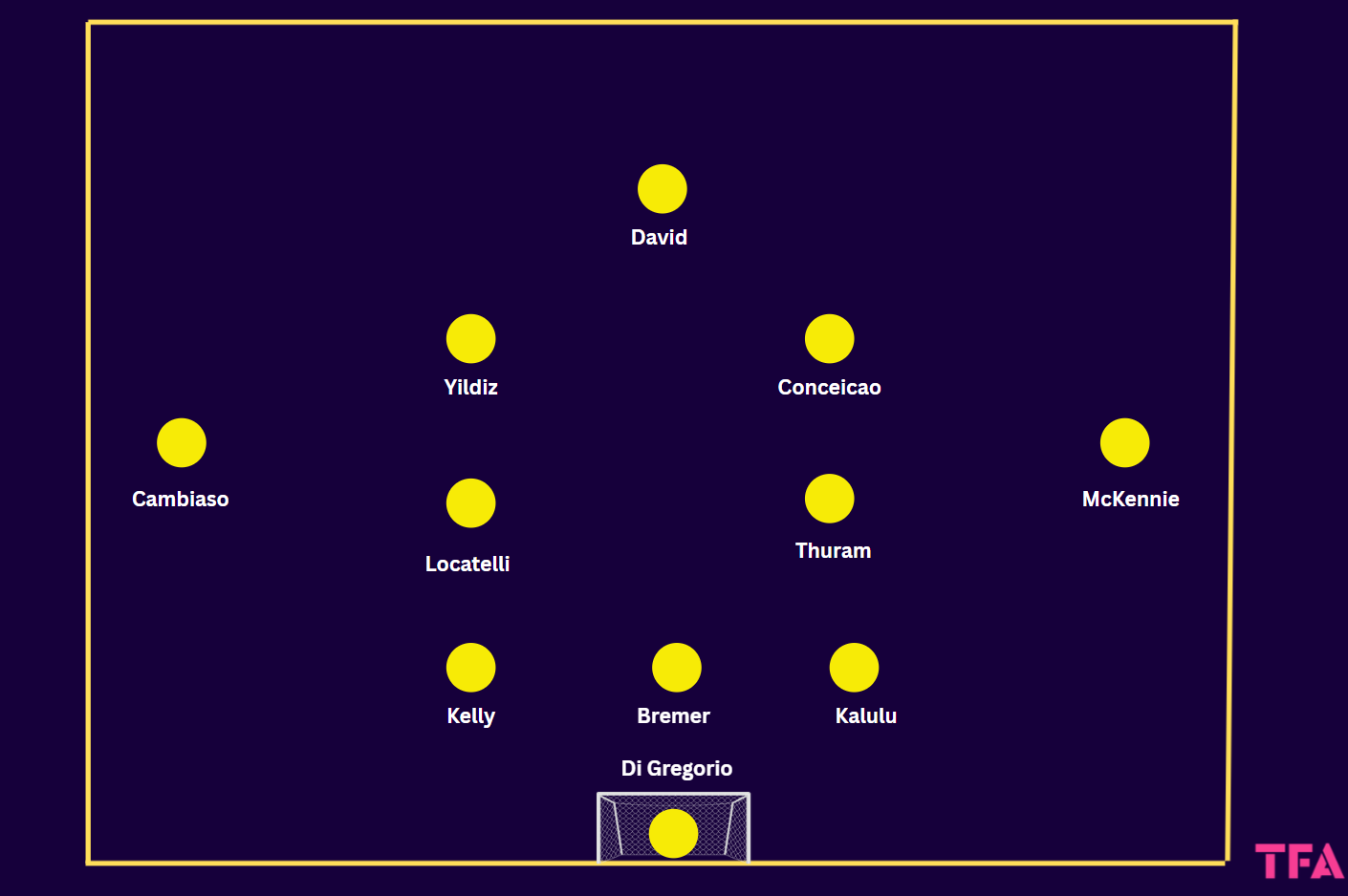 Cambiaso will often be found inverting, with Locatelli (more on his role later) often dropping into the back three, and Khéphren Thuram playing more of a traditional ‘8’ role.