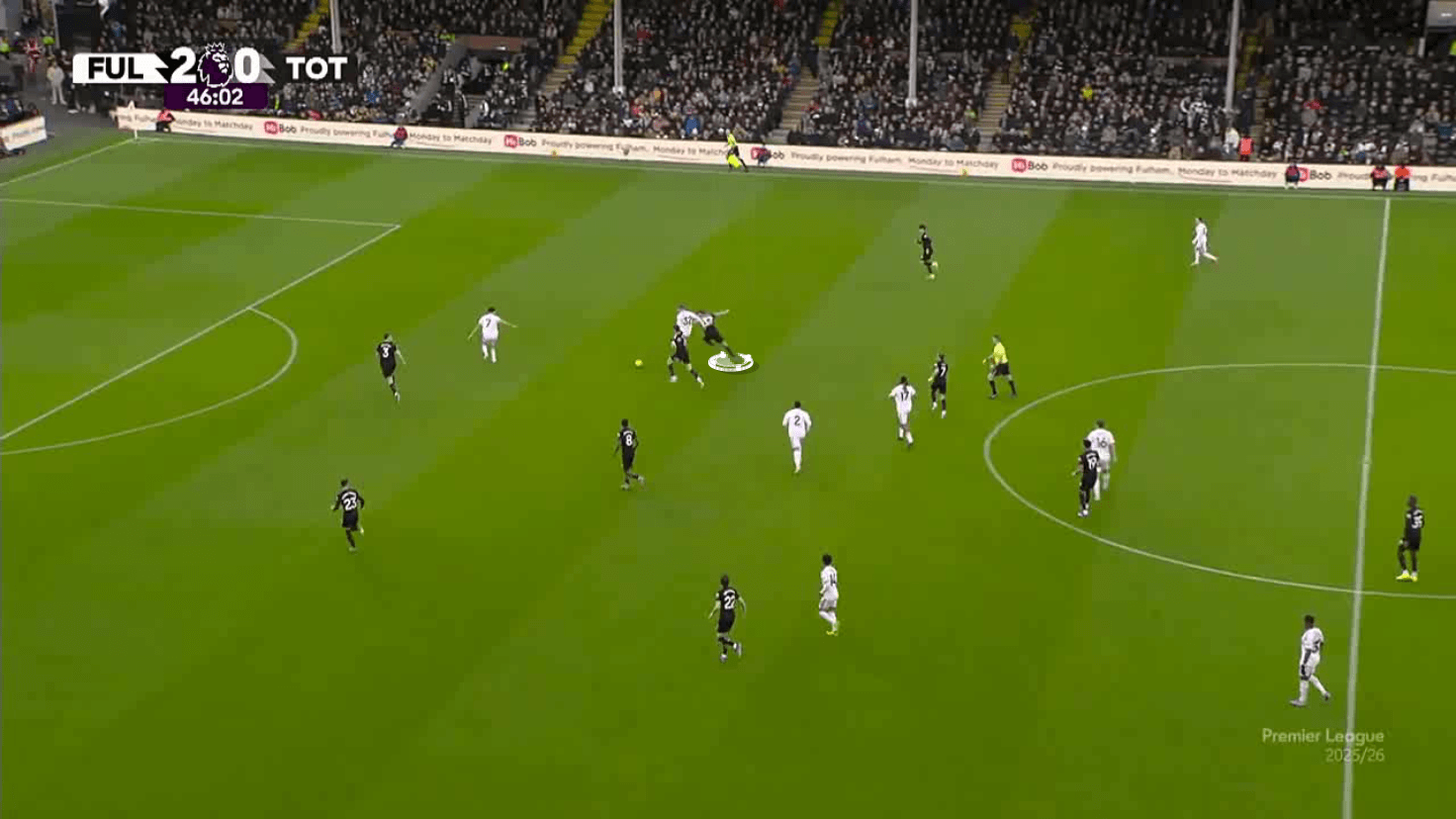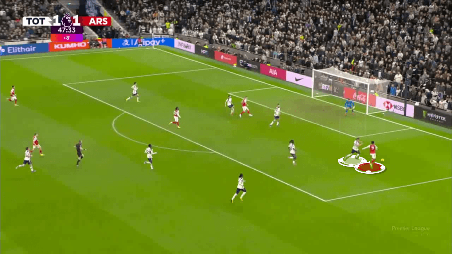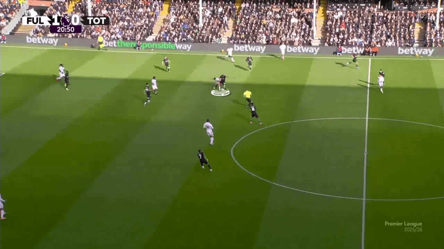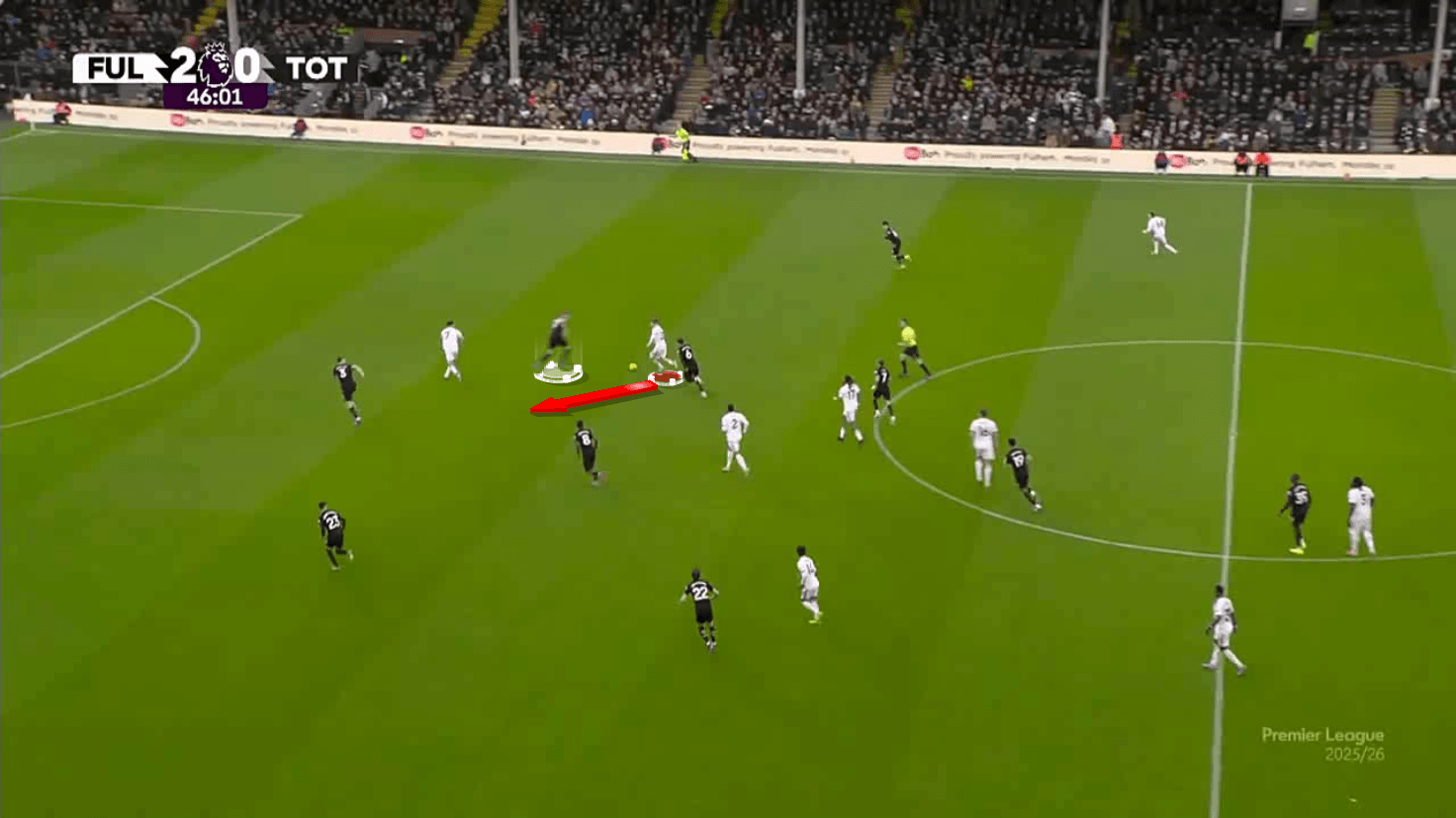 We see the outcome: the opponent takes that pause, moves to the side, and Micky van de Ven, with his speed and aggressiveness, runs past, essentially a moving pilon.