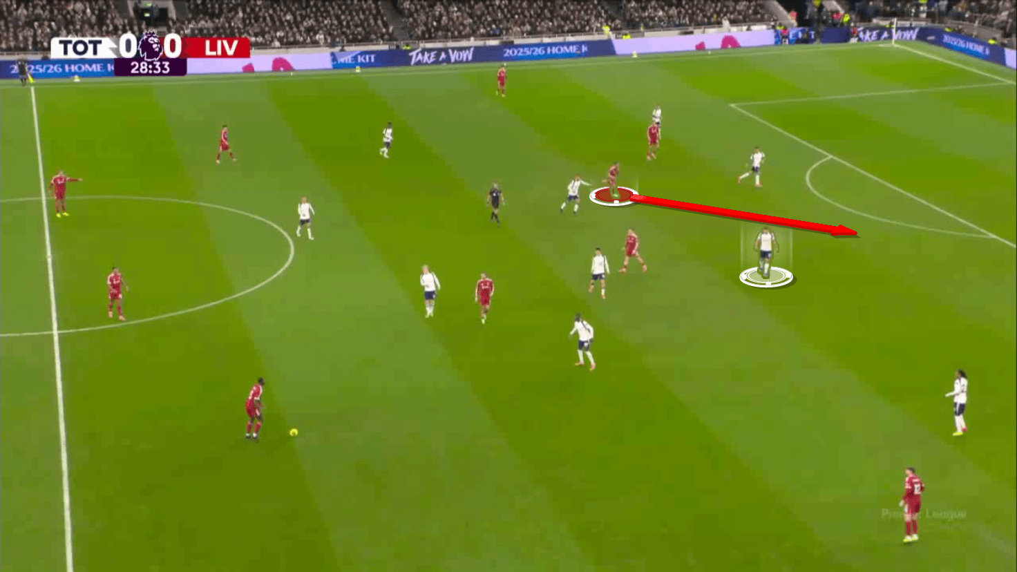 Now, the space behind is open, and the Liverpool player is looking to run into that space, all while Micky van de Ven is oblivious to that run being made right behind him.