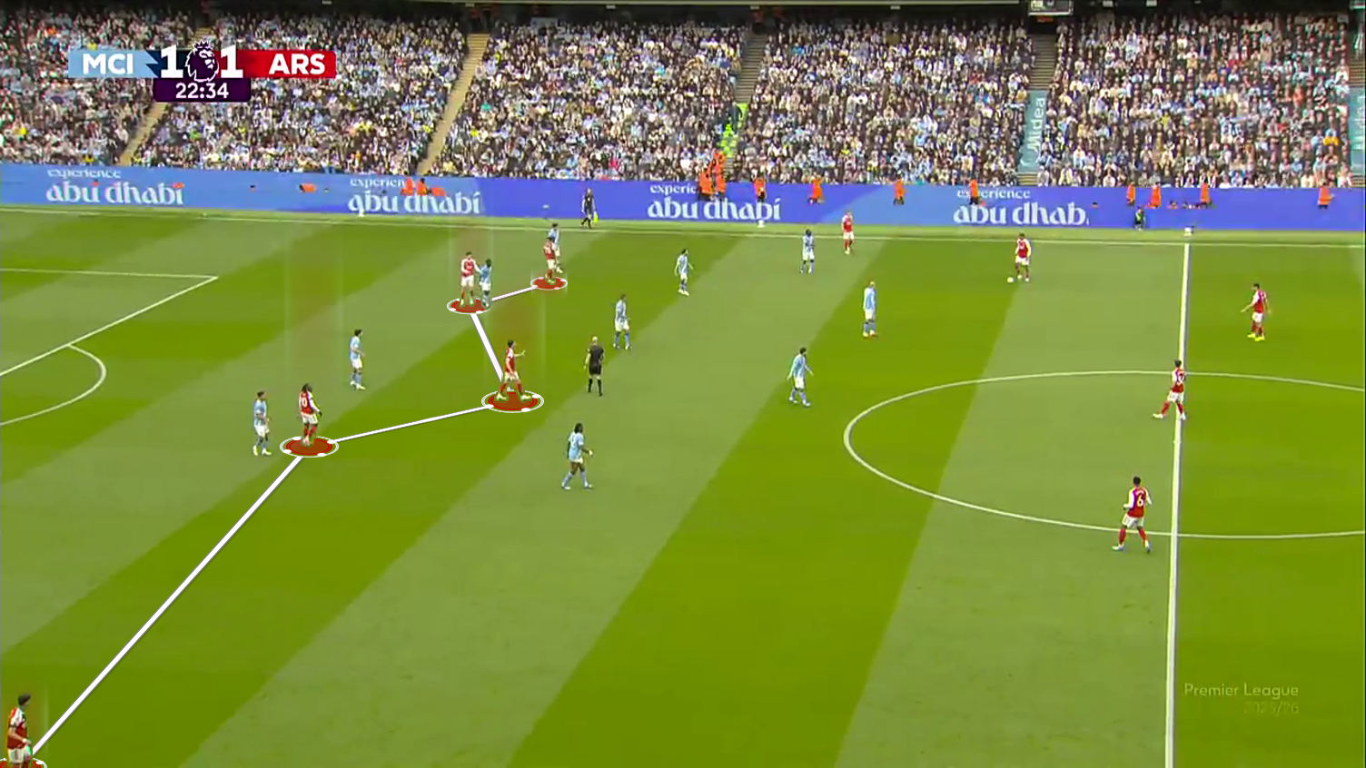 Arsenal pushed five players up to the last line of defence, creating a 5v4 against City’s backline.