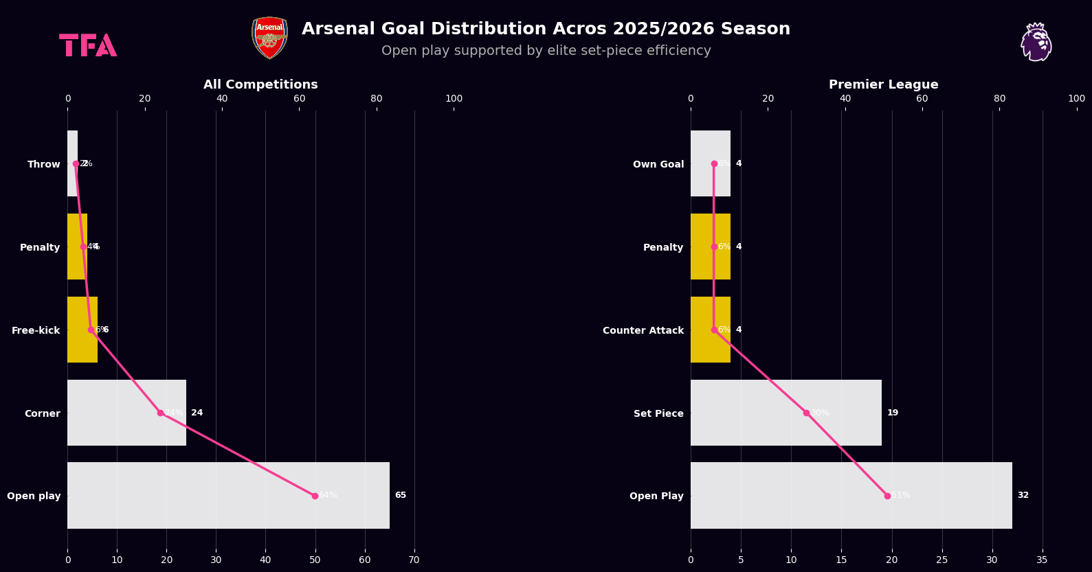 Arsenal Goal Distribution 2025/2026 - Open Play Supported By Elite Set-Piece Efficiency