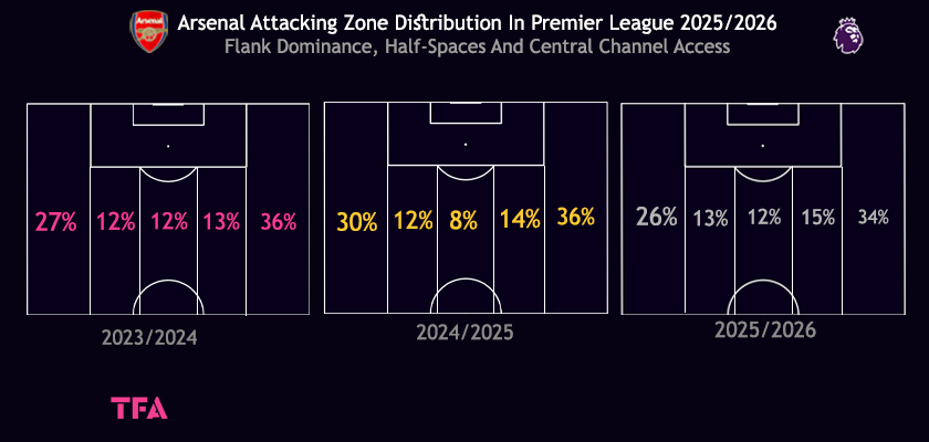 Arsenal Attacking Zone Distribution In Premier League From 2023/2024 To 2025/2026