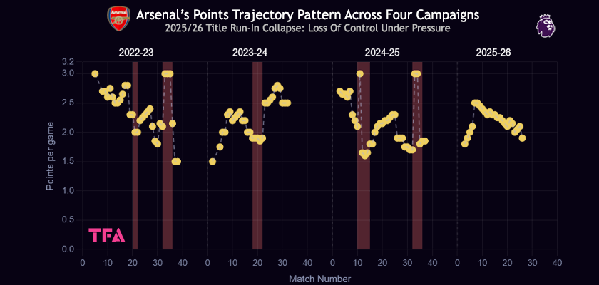Across the past four Premier League seasons, Arsenal have shown a recurring pattern of strong point accumulation followed by late-stage instability, and the 2025/2026 campaign has reinforced this trajectory.