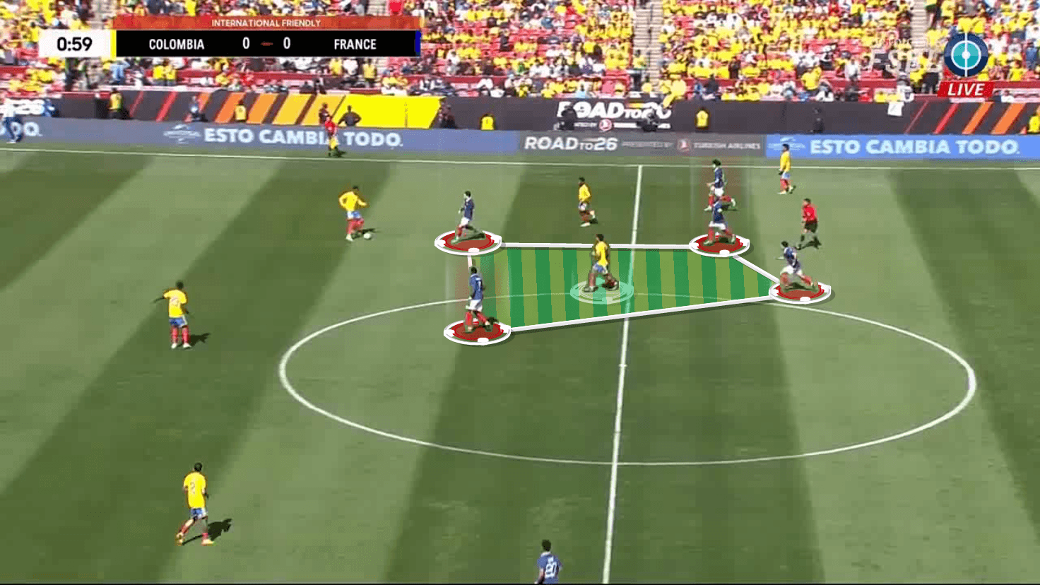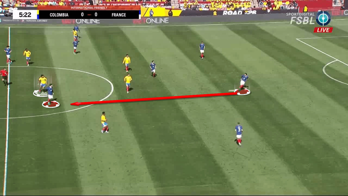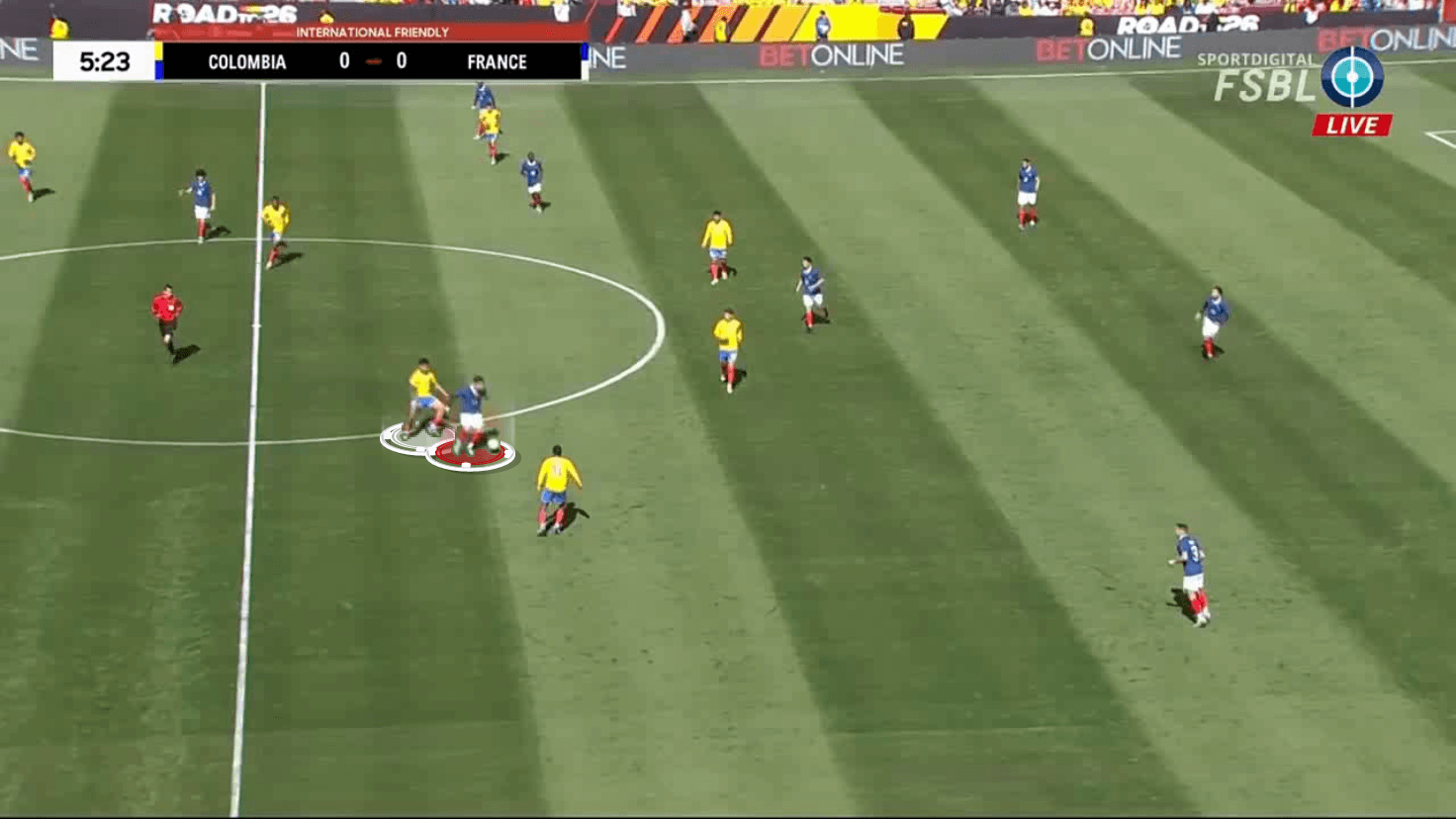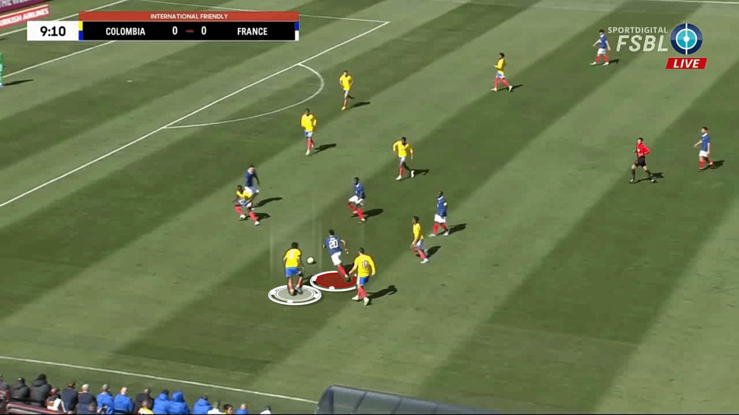 Now the French player has lost the option of playing forward, given that Ríos will intercept.