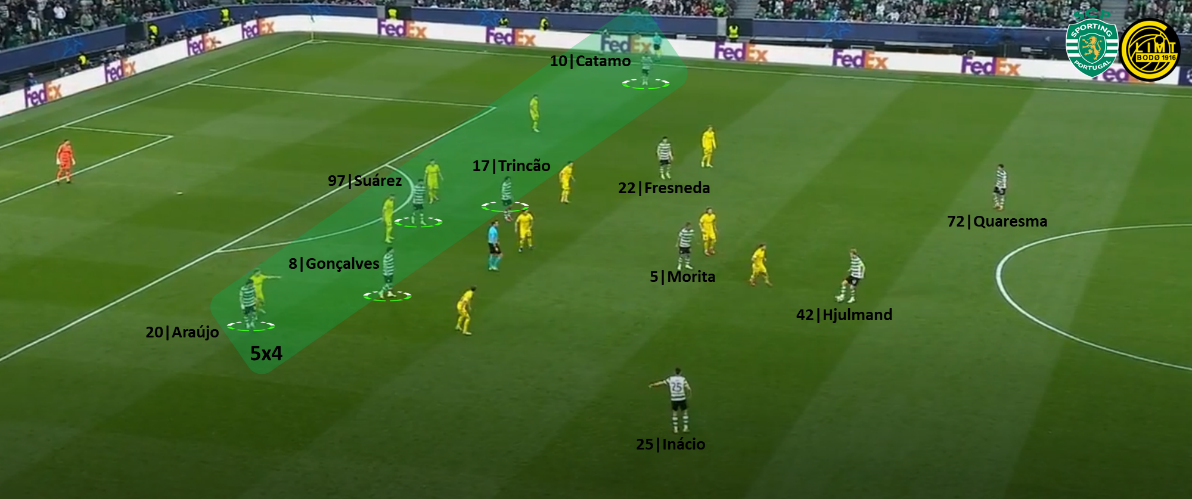 Sporting position five players against the opponent’s back four, creating a 5v4 numerical superiority on the last line.