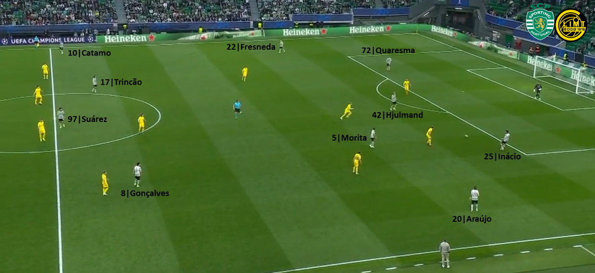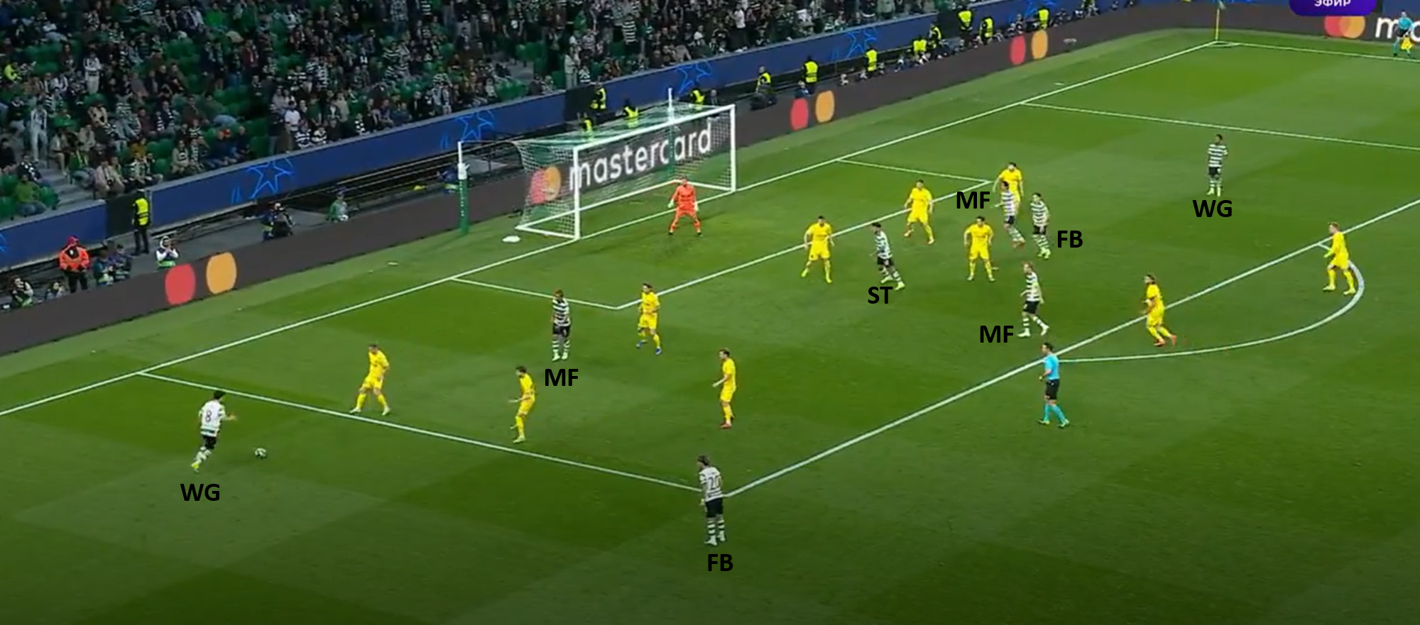 Around him, Trincão and Gonçalves operate in the half-spaces, providing connections between the lines and an attacking presence in interior channels.