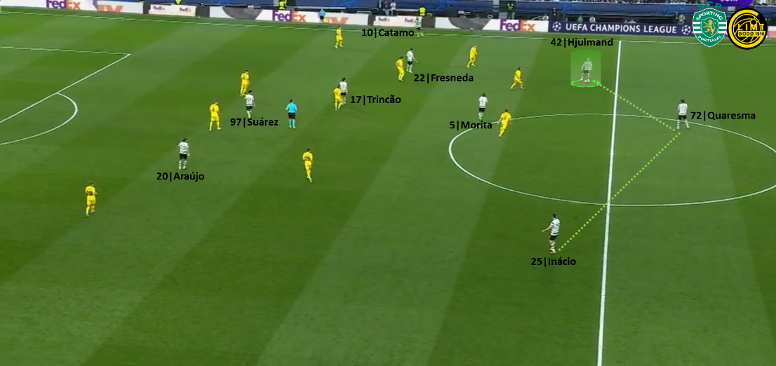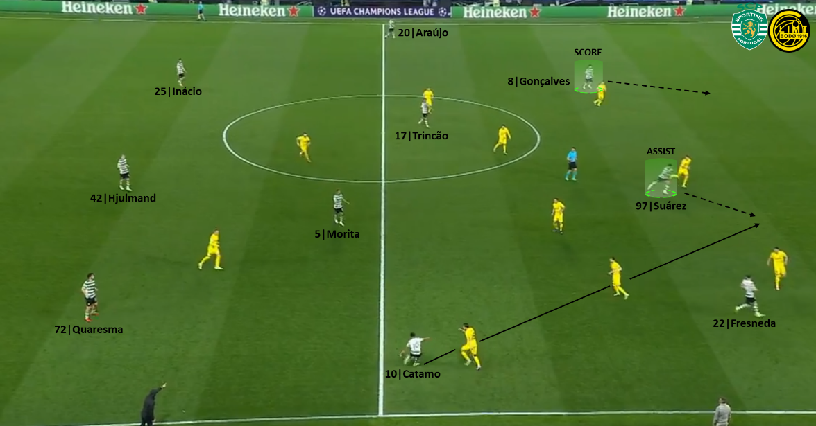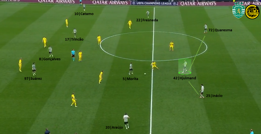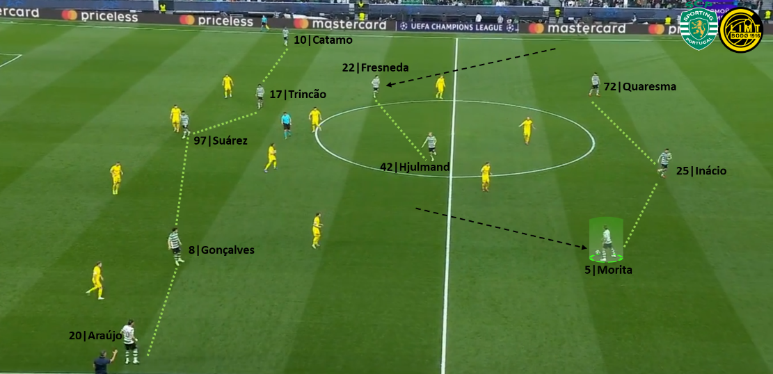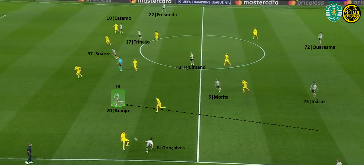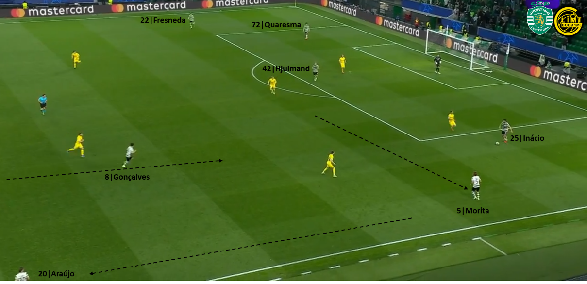 At the same time, Trincão positions himself more centrally with Morita, ensuring defensive balance, being well-positioned to react in case of a defensive transition while Fresneda advances.