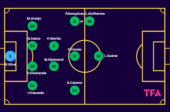 Width is generally provided by the winger Geny Catamo on the right side and full-back Araújo on the left.