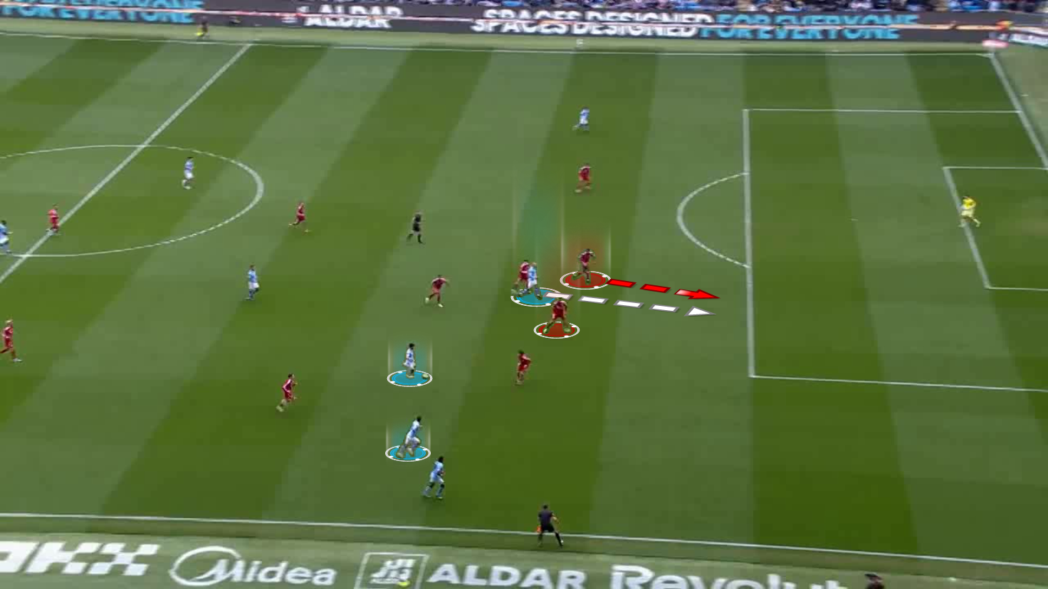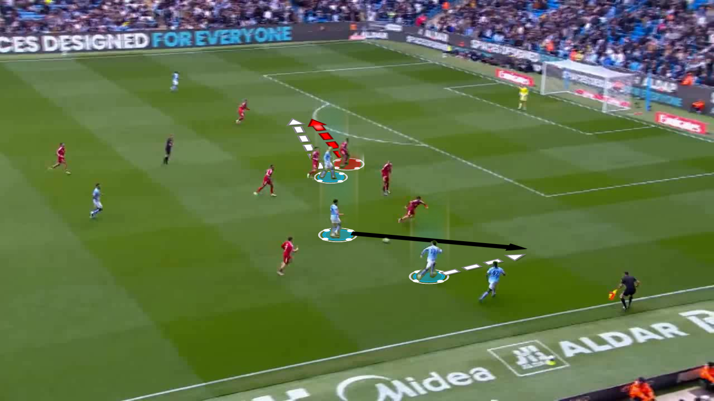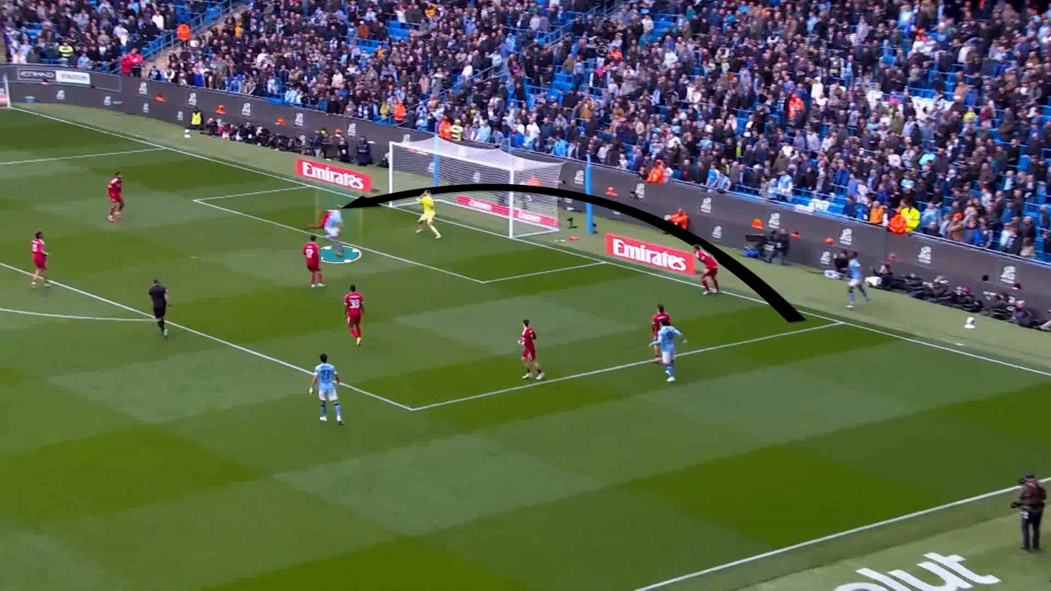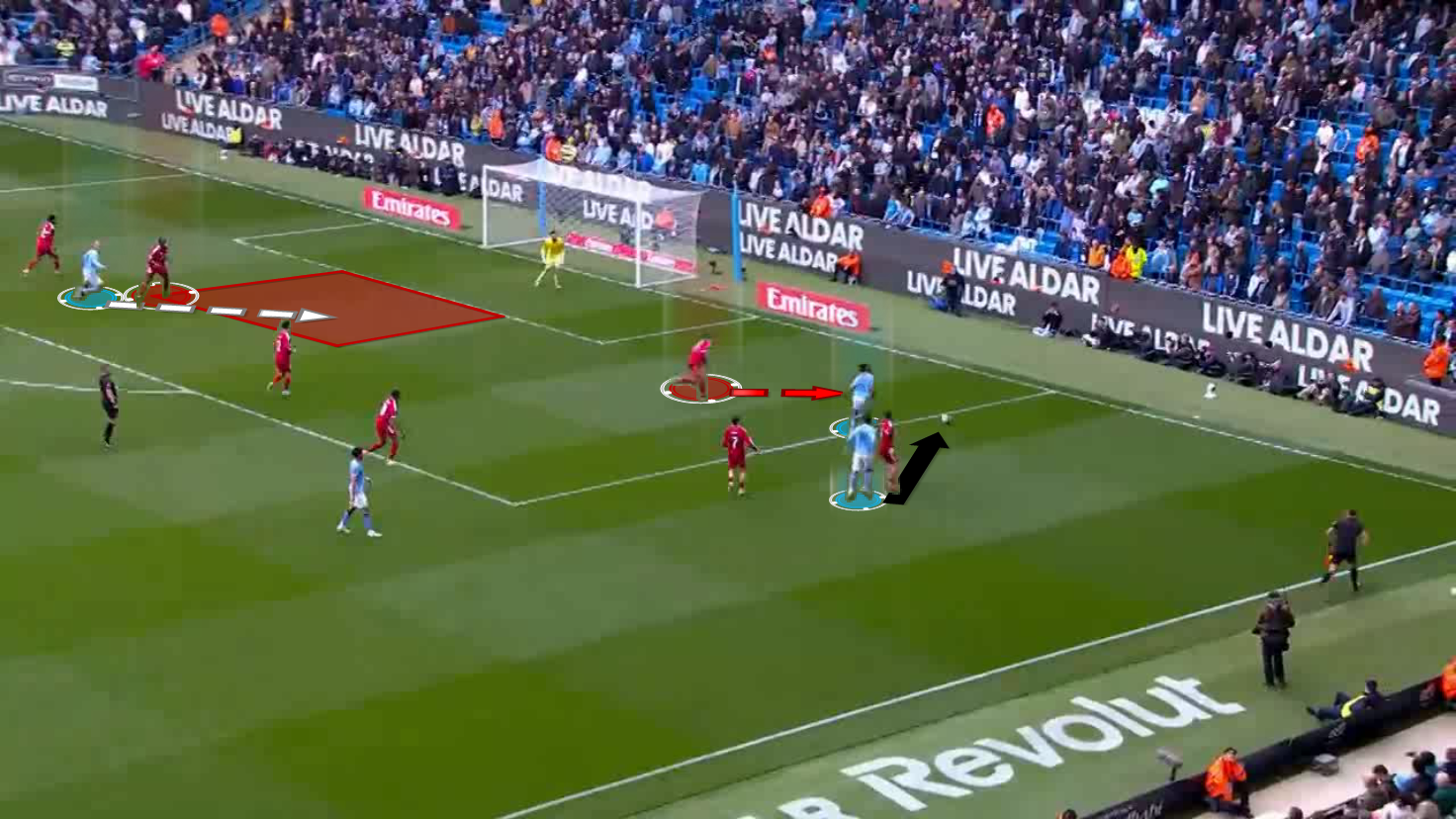 Should City have managed to work the ball into a deep crossing position, Haaland could run across his marker, as he did with Konaté, and have an empty goal mouth to attack.