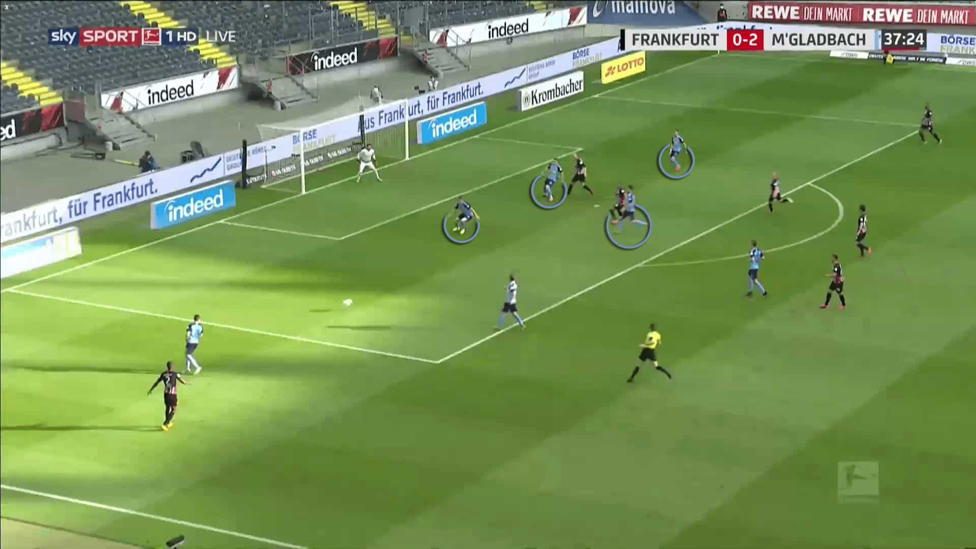 In this situation, Gladbach used a 3+1 structure to defend Eintracht Frankfurt's cross. Within their zones, each defender is close to the direct opponent.