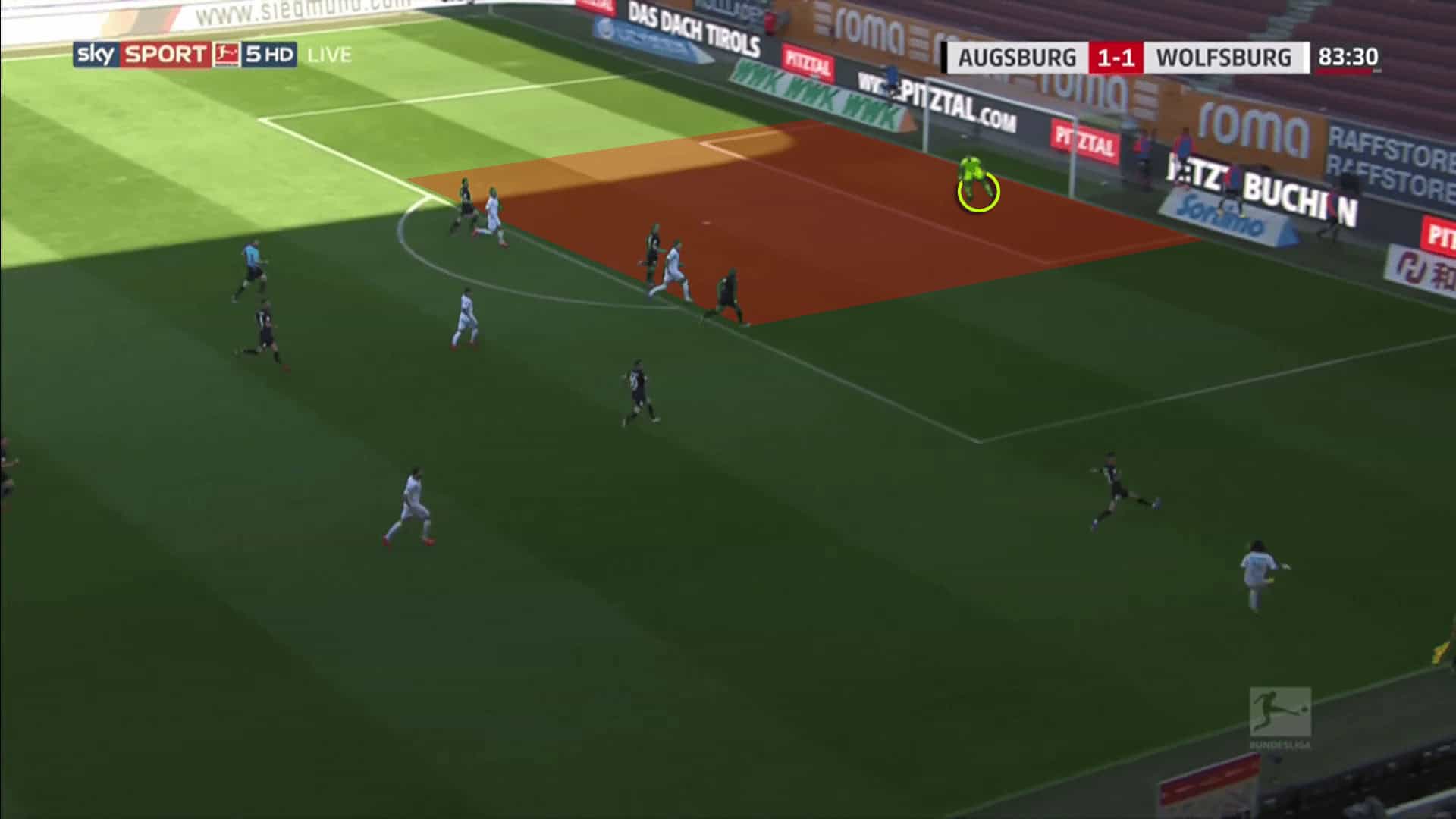 The space behind the back line (marked in red) poses a threat. Augsburg's goalkeeper Andreas Luthe is ready to defend a potential cross into this space.As the cross is close to the goal, Luthe leaves his goal and defends the cross.