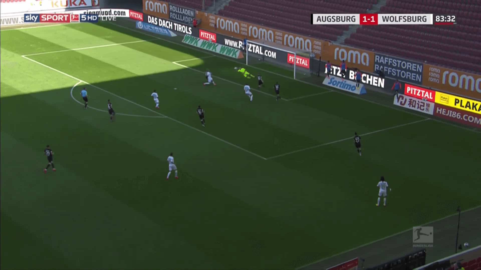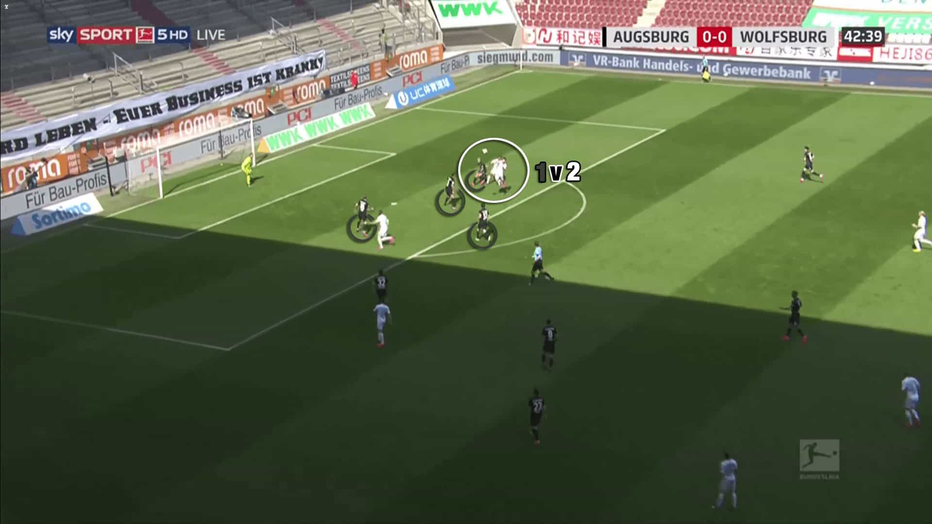 Wolfsburg score a goal from a header at the far post. Although Augsburg have a a 3v3 in the box, their full-back is left alone and therewith outnumbered in a 1v2.