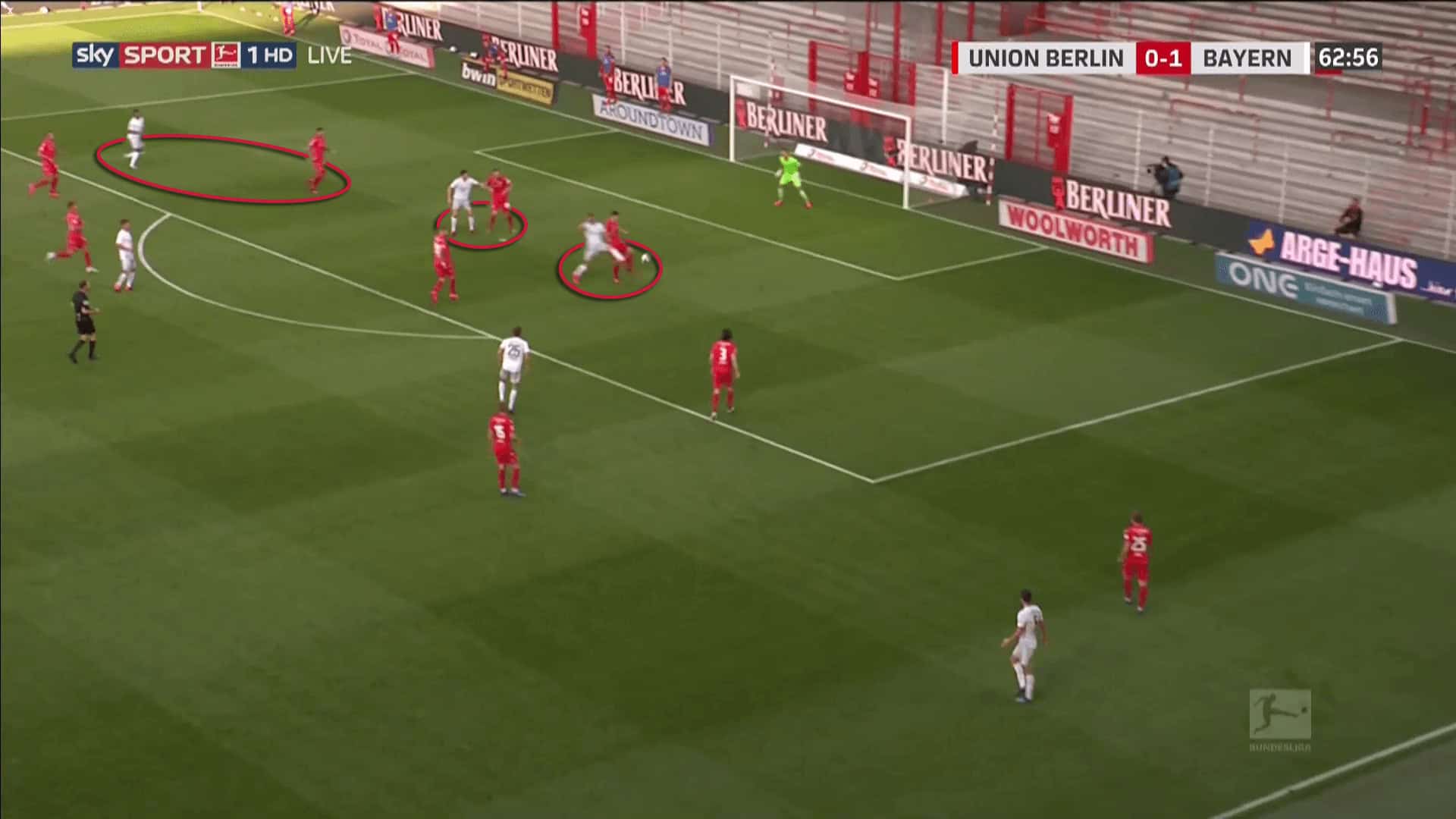 In the example below of Union Berlin against Bayern Munich, the Berlin defenders are positioned close to their direct opponents and centrally in front of the goal.