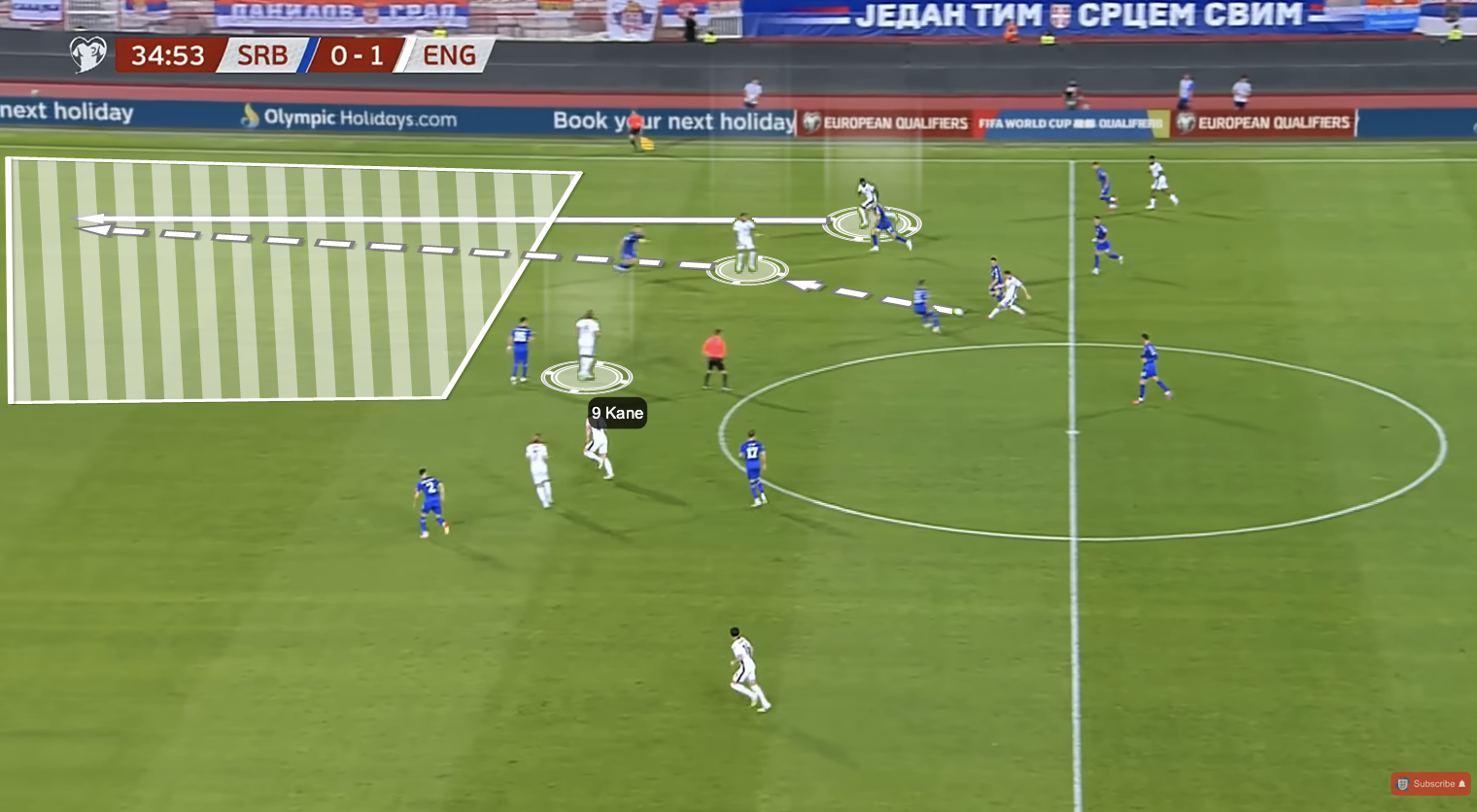 The second example here is Kane dropping way into England’s own third of the pitch and setting up a pass out wide.