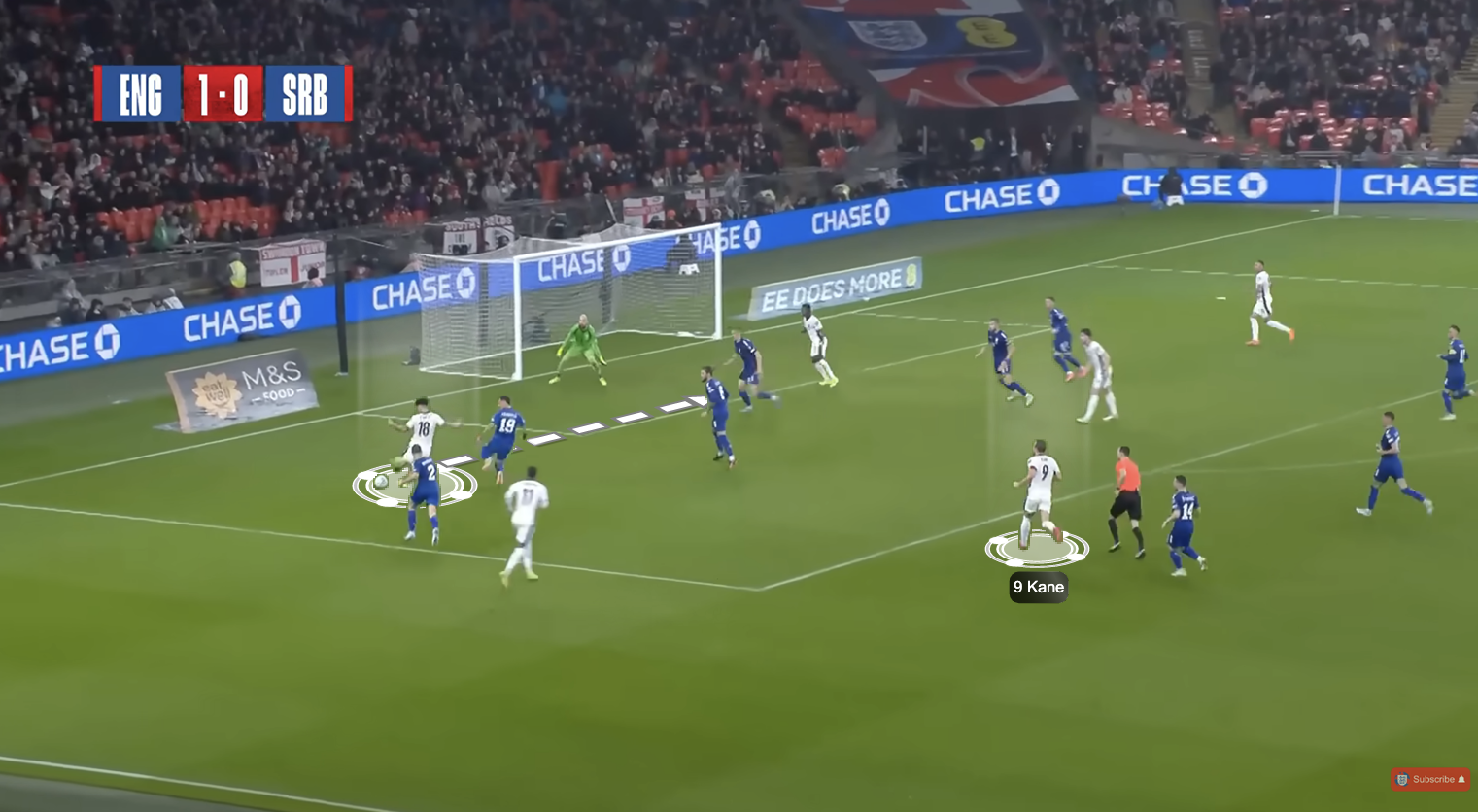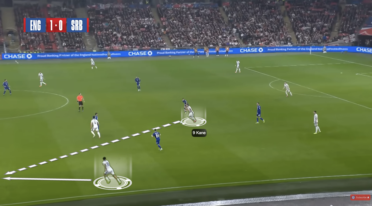 Here, Noni Madueke is going to make a run into the space not only created by Morgan Rogers dropping in, but also by Kane making one slight move towards Rogers, which opens up acres of space for Madueke to make a more central run and eventually score.